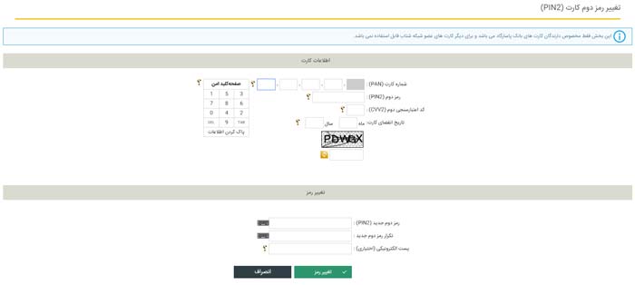 یک قسمت هم مربوط به تاریخ انقضا کارت است که در بخش ماه و سال آن را وارد می کنید که این مورد هم بر روی کارت درج شده است. سپس کد امنیتی را وارد می کنید. در کادر بعدی یعنی رمز دوم جدید(PIN 2) می بایست رمز اینترنتی خود را وارد نمایید، در قسمت تکرار رمز دوم جدید مجدد رمز اینترنتی خود را وارد می کنید. قسمت بعدی یعنی پست الکترونیکی اختیاری می باشد و الزامی برای وارد کردن آن نیست، سپس بر روی تغییر رمز کلیک می کنید تا بدین ترتیب اگر اطلاعات را به درستی وارد کرده باشید، رمز اینترنتی شما تغییر پیدا می کند.