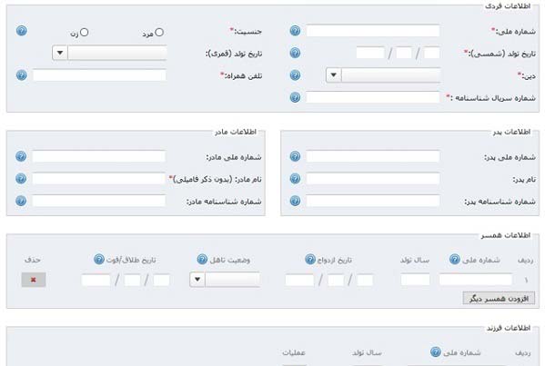 در قسمت بعدی فرمی به شما نشان داده می شود که می بایست اطلاعات فردی، اطلاعات پدر، مادر، همسر و فرزند خودتان را تکمیل نمایید و به مرحله بعدی بروید. این اطلاعات عبارت اند از: