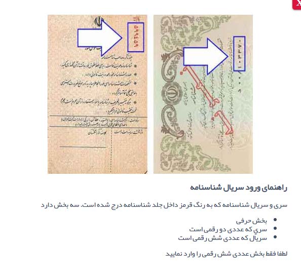 نکته: اگر که نمی دانید شماره سریال شناسنامه کجا قرار دارد بخشی به عنوان راهنما در تصویر بالا وجود دارد که اگر بر روی راهنما کلیک نمایید به شما می گوید که شماره سریال شما در کجای شناسنامه قرار گرفته است.