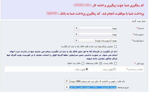 بعد از این که شما پرداخت را انجام می دهید یک کد رهگیری به شما نمایش داده می شود که شما باید این کد را در جایی نگه دارید و در دفترچه یادداشت خود، بنویسید. در ادامه برای روند کار می بایست نوبت گیری را انتخاب نمایید. در این قسمت باید استان، شهر و یا روستای خودتان را انتخاب نمایید. در قسمت بعدی محل دفاتر، جایی که عکس کارت ملی شما گرفته می شود را تعیین کنید که می توانید، دفاتر ثبت احوال، دفاتر پیشخوان و یا دفاتر پست را انتخاب نمایید. در قسمت بعدی اولویت خود را بر اساس زمان و یا مکان مشخص می کنید. سپس نام دفاتر را بر اساس آدرسی که وجود دارد، انتخاب می کنید. در ادامه تاریخ مراجعه ی خود را مشخص می نمایید. در انتها بر روی نوبت گیری کلیک می نمایید.