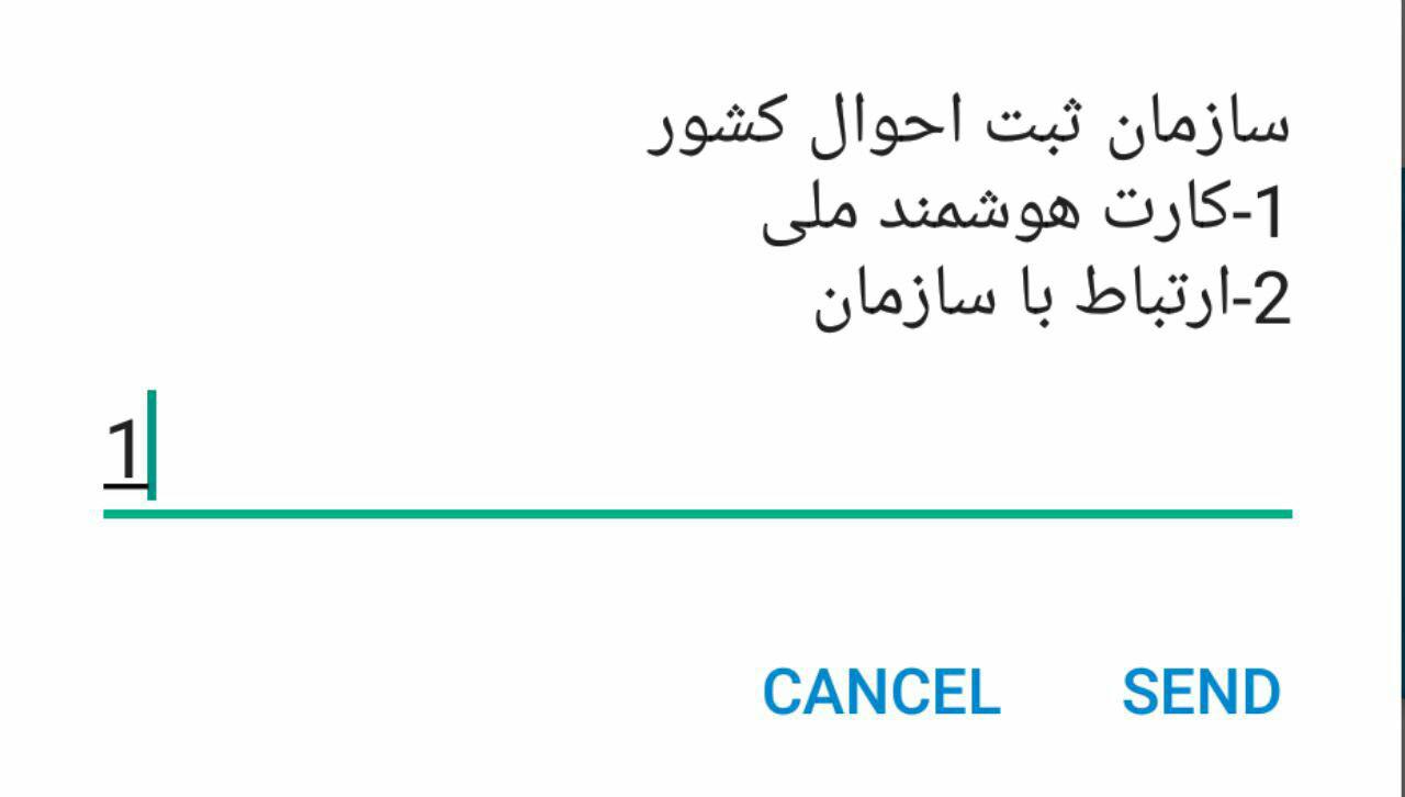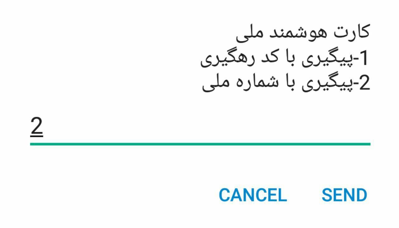 شما می توانید برای پیگیری کارت ملی هوشمند خود کد ستاره 4 ستاره 21 ستاره 1 مربع(#1*21*4*) را وارد نمایید(شما در ادامه مراحل به کد رهگیری و کد ملی نیاز خواهید داشت) سپس تصویری مشابه زیر را مشاهده خواهید کرد که شما گزینه ی یک یعنی کارت هوشمند ملی را انتخاب می کنید و گزینه ی ارسال را می زنید.